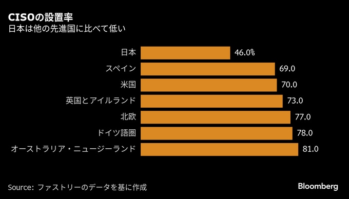 ソフトウエア企業ファストリーの報告書によると、最高情報セキュリティ責任者(CISO)を任命している日本企業の割合は約46%と、世界平均(70%)を大きく下回る。