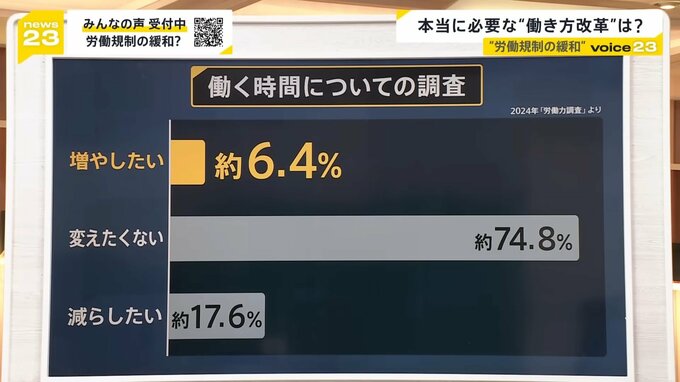労働環境全般として、現場ではいま人手不足に悩んでいる声が上がっています。2024年「労働力調査」によると、「労働時間を増やしたい」と思っている人は全体で約6.4%なんですね。これを受けて、国が実際どう動くのかという点です。