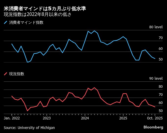(ブルームバーグ):米ミシガン大学が発表した10月の消費者マインド指数(確報値)は、5カ月ぶりの低水準に落ち込んだ。物価高が家計に与える影響を消費者が引き続き懸念している状況が示唆された。現況指数は2022年8月以来の低水準となった。