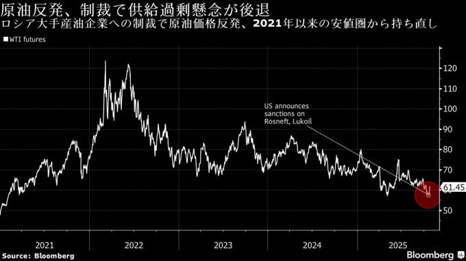 ウェスト・テキサス・インターミディエート(WTI)先物は週間では約7%上昇した。米財務省は22日、ロシアの国営石油大手ロスネフチとルクオイルを制裁対象リストに追加。ロシアの戦争遂行の資金獲得能力に打撃を与えると説明した。