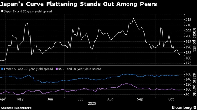日本の5年債と30年債の利回りスプレッドは今月に入って7ベーシスポイント(bp、1bp=0.01%)余り縮小し、4月下旬以降で最もタイトな状態となっている。ブルームバーグの集計データによると、この動きは米国よりも急激で、フランスで見られるスプレッド拡大とは逆の方向だ。