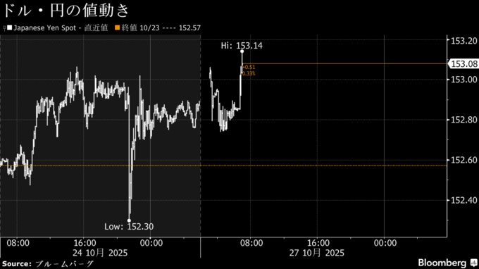 (ブルームバーグ):27日朝の外国為替市場の円相場は対ドルで153円前後と、前週末夕から下落して推移。9月の米消費者物価指数(CPI)が予想をやや下回り、米国株が最高値を更新してリスク選好のドル買いが優勢だ。