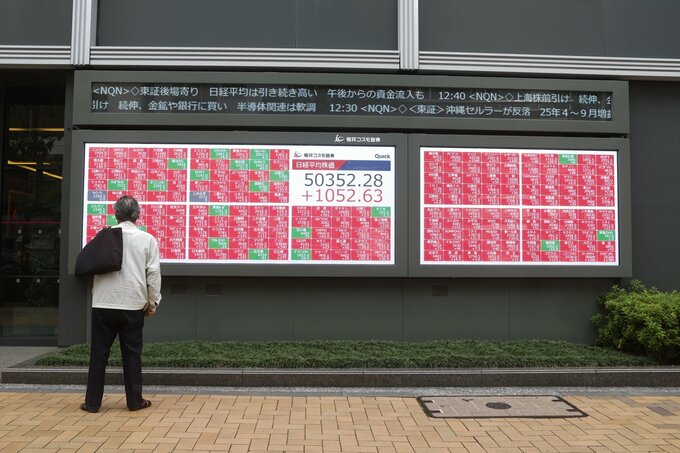 (ブルームバーグ):27日の日本市場では株式が大幅高。日経平均株価は1200円超上昇し、初めて5万円台に乗せた。米中貿易摩擦への警戒が後退してリスク選好の動きが強まった。国内の政策期待も株高につながった。債券と円は下落した。