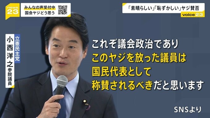 一方、立憲民主党の小西参院議員は、「素晴らしいヤジ」と投稿。