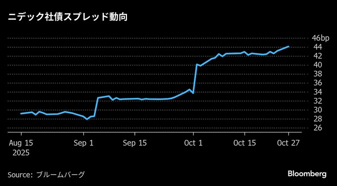 ニデックの経営に対する懸念は、株式市場だけでなく社債市場にも広がっている。ニデックの社債スプレッド(国債との利回り格差)は拡大している。ブルームバーグのデータによれば、2027年11月償還のニデック債のスプレッドは、約44ベーシスポイント(bp、1bp=0.01%)と、9月初旬の29bpから広がった。