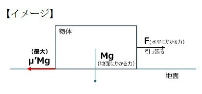 静止摩擦係数をμ'、物体の質量(重さ)をM、重力加速度をgとすると、静止摩擦力の最大値はμ'Mgとなる。これを超える力が水平方向に加わったとき、ついに物体は水平方向に動くのである。