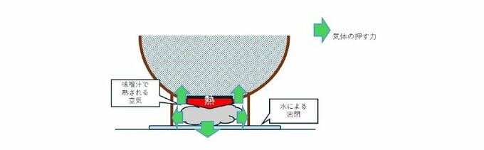 しかし、高台に閉じ込められた空気が、熱い味噌汁で温められることによる影響を加味して考えてみると、以下のようになる。