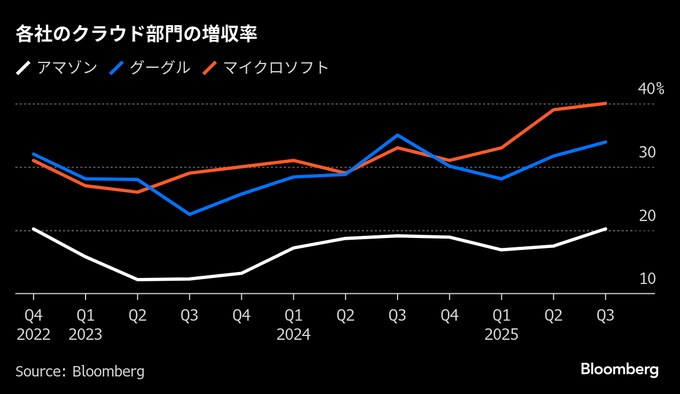 AI分野の恩恵がまだ十分に得られていないとの懸念がくすぶる中、アマゾンの株価は今年、同業他社に出遅れていた。7-9月期ではマイクロソフトのクラウドコンピューティング事業「Azure(アジュール)」がAWSの倍近い増収率を記録し、アルファベット傘下グーグルのクラウド部門は売上高が33.5%増だった。