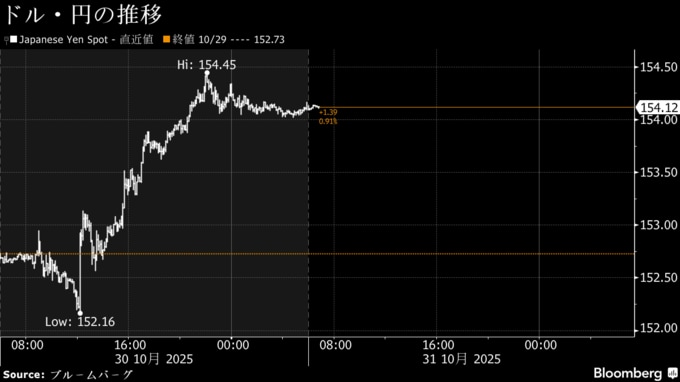 (ブルームバーグ):31日朝の外国為替市場の円相場は対ドルで154円台前半と2月以来の安値圏で推移。日本銀行の植田和男総裁の記者会見を受け早期利上げ期待が薄れ、円売り・ドル買いが進んだ。米国の12月利下げ観測の後退もドルを支えた。