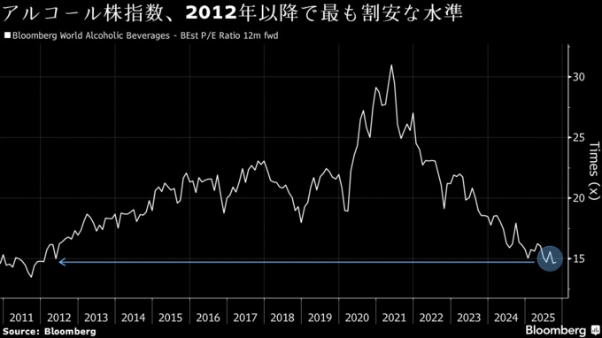 一方で、株価急落後の今を買いの好機と考える投資家もいる。ブルームバーグの世界アルコール株指数の予想株価収益率(PER)は現時点で約15倍と、21年のピーク時の半分に満たない。