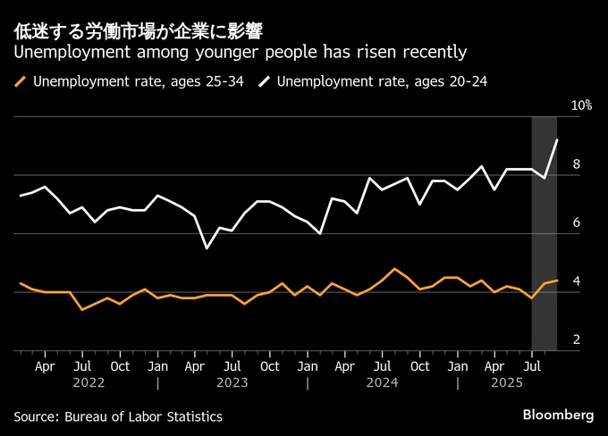 広範な消費者層が家計の厳しさを実感する中でも、特に苦しい状況にあるのが低所得層と若い労働者だ。25-34歳の失業率は、今年半ばに一時低下したもののここ数カ月、再び上昇している。