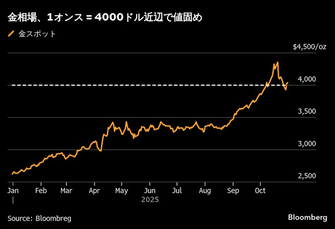金スポット相場はニューヨーク時間午後2時45現在、前日比21.18ドル(0.5%)安の1オンス=4003.36ドル。ニューヨーク商品取引所(COMEX)の金先物12月限は19.40ドル(0.5%)安の3996.50ドルで引けた。