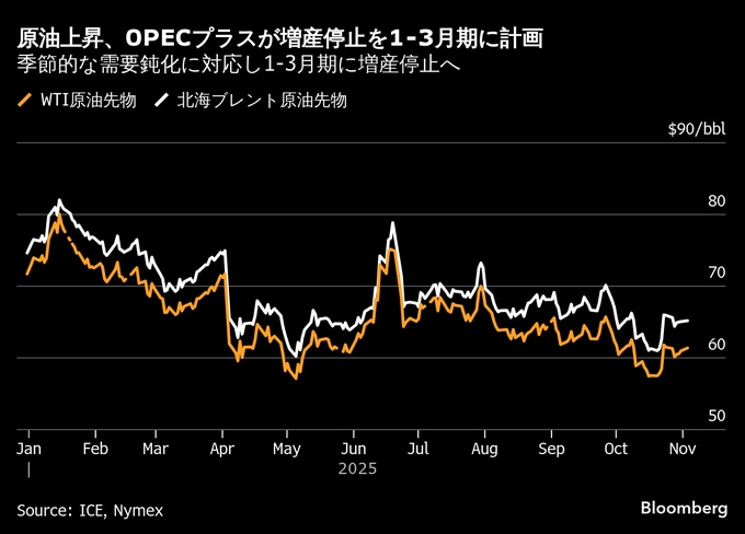 (ブルームバーグ):3日の取引で、原油価格は方向感を欠く展開となっている。石油輸出国機構(OPEC)と非加盟産油国で構成するOPECプラスは12月に生産を小幅に引き上げた後、需要が減速するとみて2026年1-3月は生産量を維持する計画を示したが、それでも供給過剰になると市場では見込まれた。