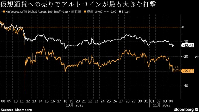 (ブルームバーグ):暗号資産(仮想通貨)に対する売り圧力が続き、ビットコインが3日に10万7000ドルを下回った。アルトコイン(ビットコイン以外の暗号資産の総称)の下げはさらに大きく、3週間前の「暗号資産史上最大の清算イベント」でレバレッジ取引の巨額ポジションが一掃された影響がなおくすぶっている。