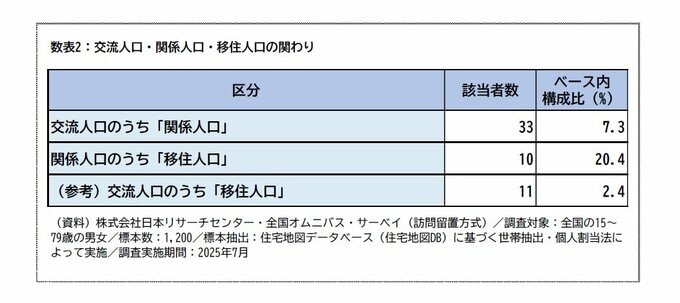 ニッセイ基礎研究所が総合調査機関・日本リサーチセンターの全国社会調査(訪問留置法、n=1200、住宅地図データベースによる世帯抽出・個人割当、2025年8月実施)のデータを用いて、交流人口(観光・交流)、関係人口、移住人口を意向者ベースで可視化したところ、地域との関わり意向をもつ人々は、交流人口(観光・交流意向)が全体の約4割、関係人口(定期訪問・長期滞在意向)が約4%、移住人口(定住意向)が1%台に留まることがわかった。