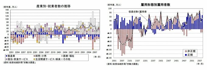 産業別には、製造業(前年差16万人減)、卸売・小売業(同13万人減)は6ヵ月連続で減少したが、宿泊・飲食サービス業(同12万人増)が2ヵ月ぶりに増加し、医療・福祉(前年差28万人増)は13ヵ月連続で増加した。