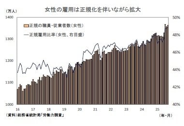 女性の正規雇用比率は13年1月の調査開始以来、最高水準を更新した。女性の雇用は正規化を伴いながら拡大している。