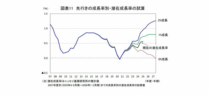 2025年度上期の潜在成長率は現時点の0.6%から2%成長で0.9%、1%成長で0.7%となる。逆に、0%成長の場合は2025年度上期の潜在成長率が0.2%まで低下する。