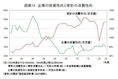 一方、企業の投資性向は、1990年代半ばまでは100%を上回っていた。このことは企業がキャッシュフローを上回る水準の設備投資を行っていたことを意味する。