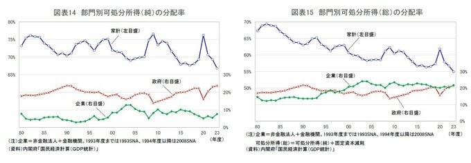 一方、企業の可処分所得の分配率は横ばい圏で推移しているが、政府は新型コロナウイルス感染症の影響で経常移転の支払いが膨らんだ2020年度を除いて、近年は分配率の上昇傾向が続いており、2023年度には純ベース、総ベースともに1990年代初頭のピークに近い水準に達した。