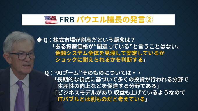 ただ、パウエル議長は株価への懸念を示しつつも、AIブーム自体については「長期的な視点に基づいて多くの投資が行われている分野で、生産性向上を促進する」と評価しています。「ビジネスモデルがあり収益も上げているので、ITバブルとは別物だと考えている」とも明言。