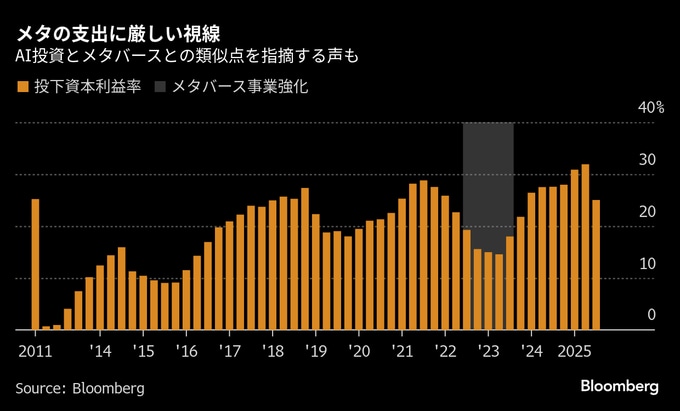 メタの投下資本利益率(ROIC)は第3四半期に25%となり、過去最高の約32%を記録した前四半期から大きく低下した。それでも、メタバース事業への多額投資が支出を押し上げていた2023年当時と比べれば、依然として高い水準を維持している。