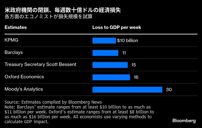 閉鎖が1週間続くごとに100億-300億ドル(約1兆5400億円-4兆6100億円)の経済損失が発生していると、アナリストらは予想する。予想の幾つかは、150億ドル前後に集中している。