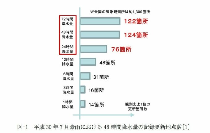 たとえば、2018年7月に発生した西日本豪雨(以下、平成30年7月豪雨)では、記録的な降雨により48時間降水量の観測史上最大値を更新した地点は全国で124箇所に達した。