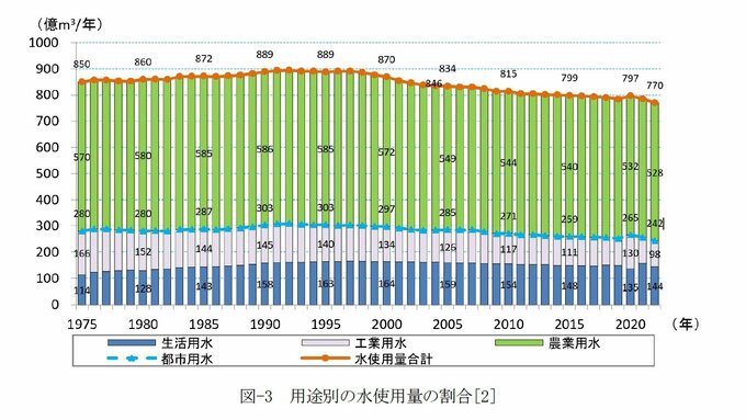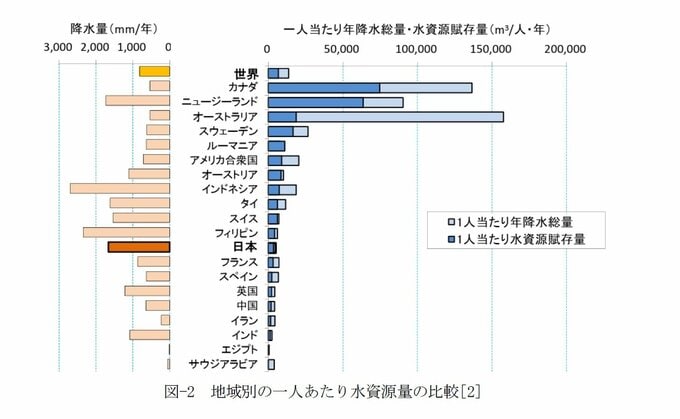 また、日本は水資源に恵まれていると考えられがちだが、実際には一人当たりの年間水資源量は約3,400立方メートルであり、これは世界平均の約半分にすぎない。