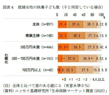 もっとも、専業主婦や年収300万円未満層では、すでに子が独立している世帯が多く、実際の子の人数よりも少なく計上されている可能性がある。また、年収700万円以上層はサンプル数が限られるため、多子世帯の割合は傾向値として見ることが妥当だ。