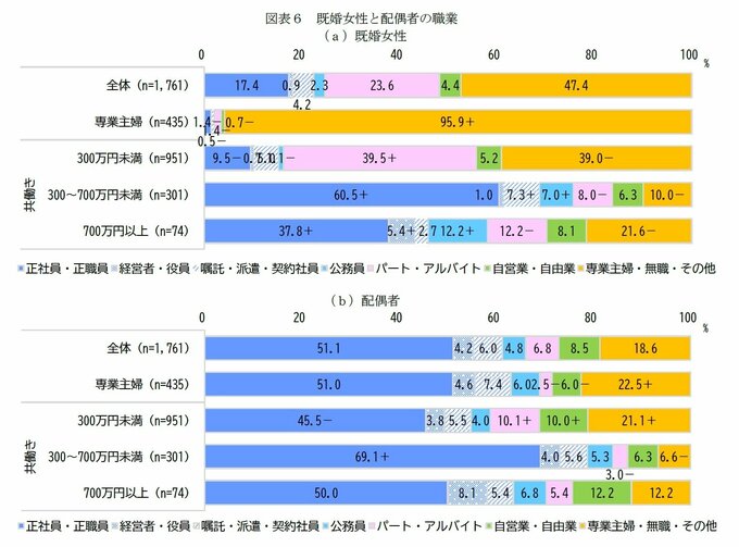 本人の職業を見ると、共働きの年収300万円未満層では「パート・アルバイト」(39.5%)が約4割を占める。一方、300~700万円未満では「正社員・正職員」(60.5%)や「公務員」(7.3%)が多く、正規雇用者が約7割(合計67.8%)にのぼる。