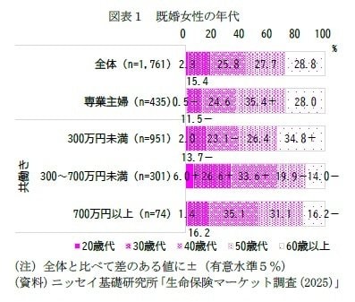 まず、既婚女性の年代分布を見ると、専業主婦や共働きの妻で年収300万円未満の層では50歳以上が6割を超える(専業主婦63.4%、年収300万円未満61.2%)。