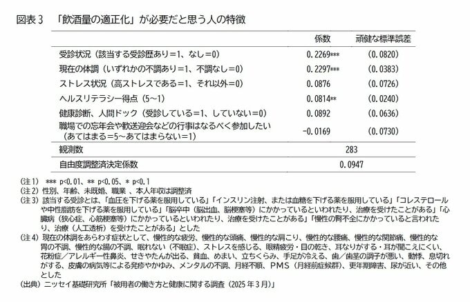 本稿では、被用者を対象とする調査データを用いて、飲酒量が生活習慣病リスクを高める水準にある人のうち、「飲酒量の適正化」が必要だと認識している人の特徴を分析した。
