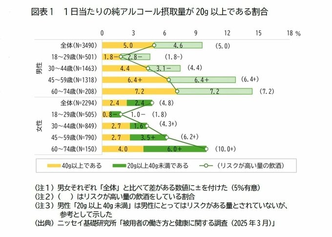 しかし、男女それぞれにとってのリスクがある飲酒量(男性の40g以上、女性の20g以上)をふまえると、リスクが高い量の飲酒をしている割合は男女とも全体でおよそ5%程度だった。