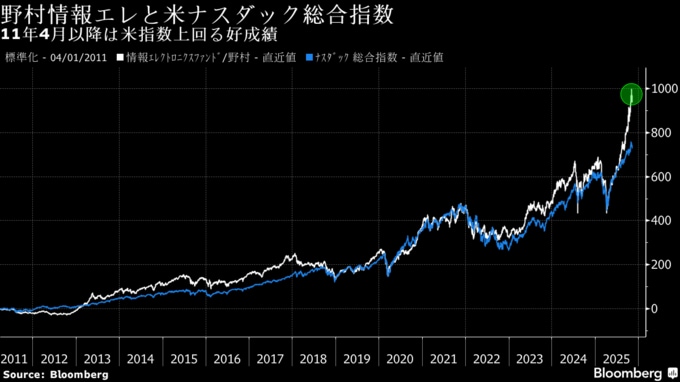 同ファンドの25年のトータルリターンは11月6日時点でプラス49%と、運用資産総額が100億円以上の類似ファンド9本の中で上昇率トップ。同期間の東証株価指数(TOPIX、配当込みベース)の22%、TOPIX電機指数の30%を上回る。9月末時点の組み入れ銘柄上位はソフトバンクGやフジクラ、古河電工、ソニーグループ、東京エレクトロンなど。