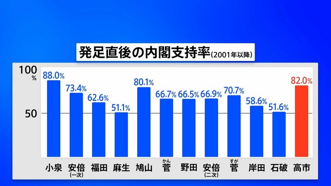 10月21日に発足した高市内閣の支持率がJNNが11月1日、2日に行った調査によると82.0%であることが分かった。政権発足直後の支持率としては2001年以降の歴代内閣で比較すると小泉内閣(88.0%)に次ぐ2番目の高さだった。(ちなみに過去30年遡っても同じ結果だった)