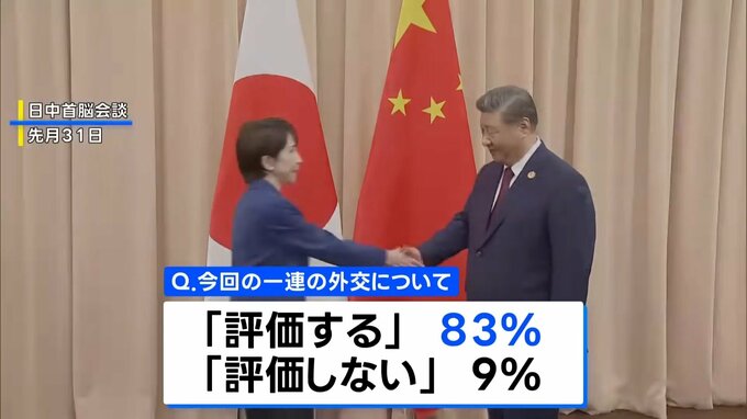 次に「外交デビュー」となったASEAN首脳会議出席、日米、日韓、日中首脳会談、APEC首脳会談などこうした外交については83%が「評価する」と回答している。今回の外交成果が大きく世論の支持を押し上げたといって良いだろう。官邸幹部も「外交がうまくいってその直後の調査タイミングだったというのと、高市内閣に対する期待感だろう。