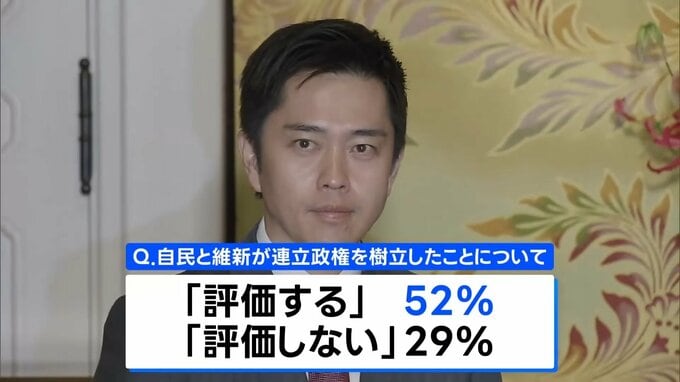 今回、自民と維新の連立についての評価を聞くと、「評価する」人は全体では52%。政党支持別で見たところ、自民支持層では72%、維新支持層では70%が「支持する」と回答する一方、公明支持層の「支持」は18%にとどまっている。