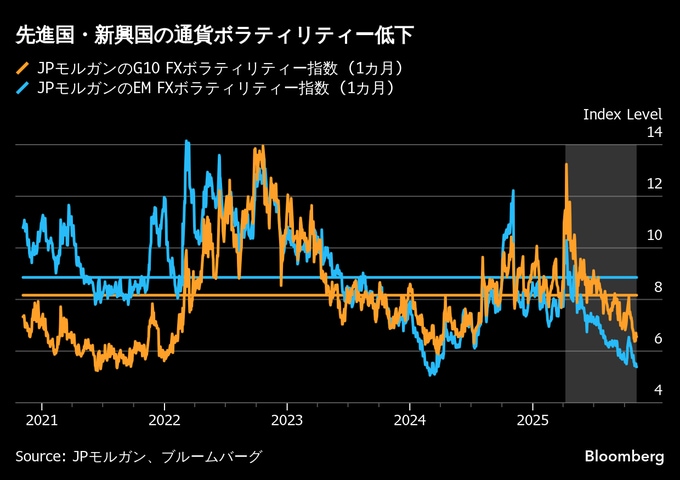 結果として、為替市場のボラティリティーは長期平均を大きく下回っている。4月にトランプ米大統領が世界的な関税措置を発表した当時見られた激しい値動きとは対照的だ。