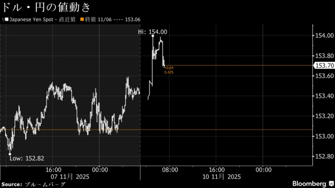 (ブルームバーグ):10日朝の外国為替市場の円相場は対ドルで153円台後半に下落して推移。米国政府機関の一部閉鎖解除に向けた動きが進展するとの観測からドル買い・円売りが優勢だ。
