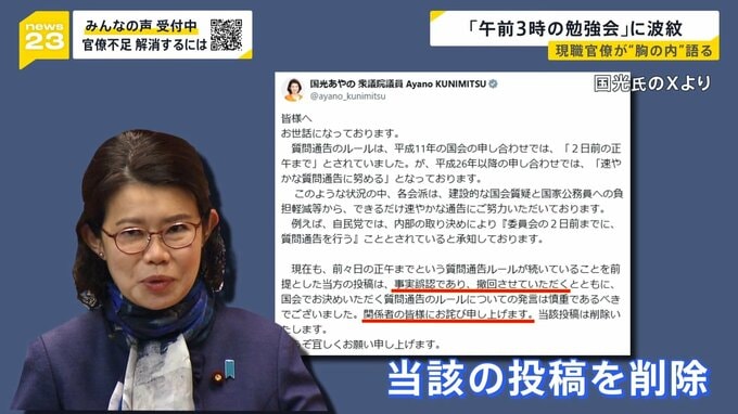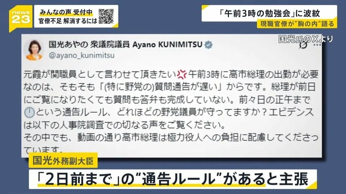 一方、私たちの取材に応じた現職の官僚は、質問通告の遅れで“負担を強いられた”過去を振り返ります。