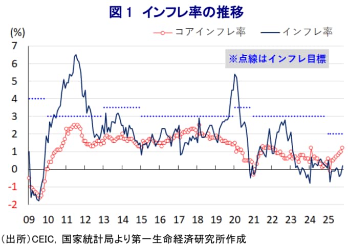 この背景には、足元の中国経済は供給サイドをけん引役に拡大が続いているものの、ここ数年の不動産不況に加え、コロナ禍以降の若年層を中心とする雇用回復の遅れも重なり、個人消費をはじめとする内需は力強さを欠くなど需給ギャップが拡大する動きが顕在化している。