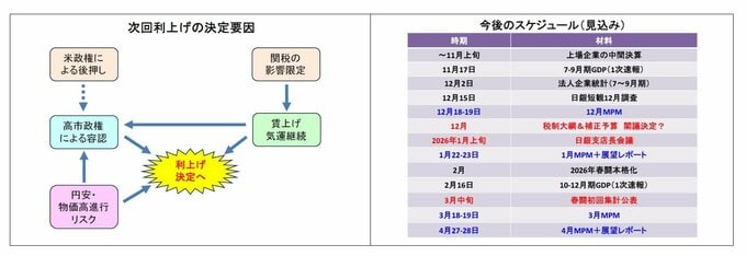 日銀としては、政府などに対して利上げに踏み切る根拠を最も示しやすいタイミングと言えるだろう。また、予算編成や税制改正といった年末の政治イベントを通過していることも利上げのハードルを下げる方向に寄与しそうだ。