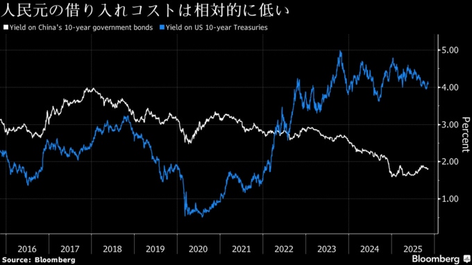 適度に緩和的としている金融政策やデフレ圧力によって、中国の債券利回りは米国債の利回りを大きく下回っており、低い借り入れコストも新たな魅力として浮上している。