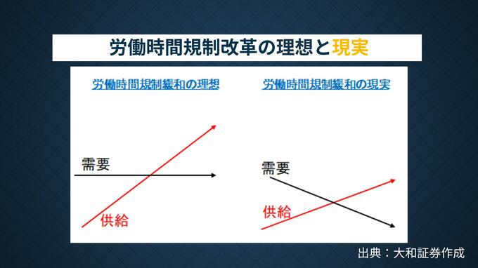 「理想」は、労働時間が増えて供給力が高まるものの、需要は減らないというパターン。しかし、「現実」は目論見通りにはならず、労働時間が増えることで余暇時間が減少、それに伴い需要も減退する可能性があると言います。