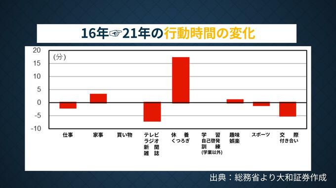 これを示す一つのデータとして末廣氏は総務省の「社会生活基本調査」を分析。2016年と2021年を比較すると「仕事」の時間は平均して1日あたりわずか3分の減少にとどまっていたことが分かりました。そのうえで「買い物」の時間はほとんど変化がなく、増えたのは主に「休養・くつろぎ」の時間でした。