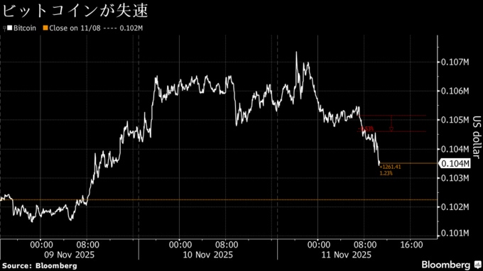 10日の取引では一時10万7000ドルを上回ったものの、その後10万5000ドルを割り込んだ。数十億ドルの時価総額が吹き飛んだ先月の急落のトラウマが残っているとみられ、投資家心理の脆さを浮き彫りにした。足元の下落は、年初来高値圏で利益確定に動いた大口保有者の売りに加え、10月初旬の強制清算の連鎖を受けた根強い不安が背景にあるとみられる。