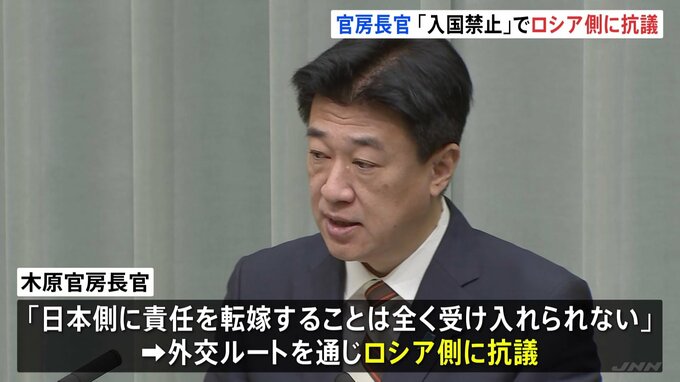 木原稔 官房長官「今回、学術関係者やメディア関係者を新たに入国禁止としたことは遺憾です」木原官房長官は、ロシア側が今回の入国禁止措置について「日本の制裁措置への対抗措置の一環」と説明していることに「…