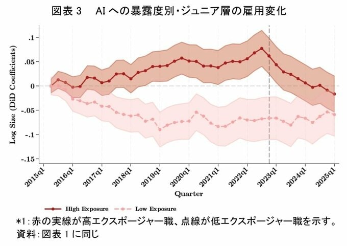 図表を見ると、赤線で示される若手(ジュニア層)の係数は、2022年第4四半期までほぼ0付近で推移しており、AI導入企業と非導入企業の間で雇用動向に差がなかったことがわかる。