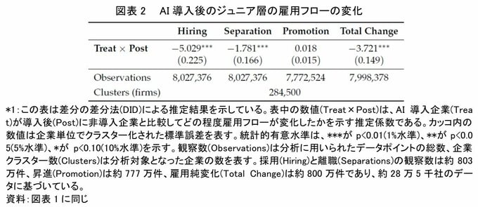 結果、高エクスポージャー職の若手雇用が急減する一方、低エクスポージャー職では有意な変化は確認されなかった。